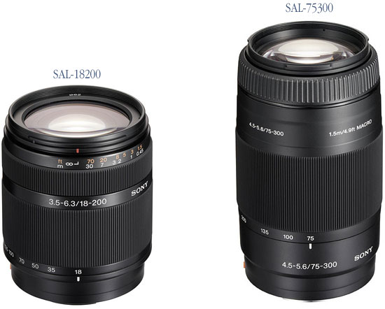 SAL-18200 включает в себя два элемента из низкодисперсионного (ED) стекла для уменьшения хроматической аберрации и три асферических элемента. SAL-75300 - компактный телеобъектив 75-300 мм (112,5-450 мм), f/3.5-6.3; подходит как для цифровых зеркалок формата APS, так и для 35 мм пленочных камер.