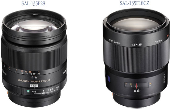 SAL-135F28 - нестандартный 135 мм (200 мм) телеобъектив обладающий способностью к размытию фона (Smooth Transmission Focus); диафрагма эквивалентна f/2.8 (T4.5). SAL-135F18CZ - один из самых ярких (f/1.8) телеобъективов (138 мм, 202,5 мм) в своем классе, оснащенный двумя ED-элементами.