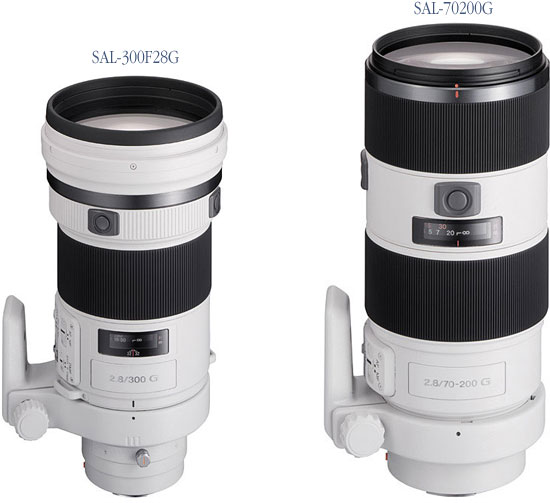 SAL-70200G - высокоскоростной SSM (Super Sonic wave Motor) 70-200 мм (105-300 мм) телеобъектив (f/2.8) G-серии с четырьмя ED-элементами и двумя режимами DMF (Direct Manual Focus). Модель SAL-300F28G имеет фиксированное фокусное расстояние 300 мм (450 мм), диафрагму f2.8. Объектива также оснащен системой SSM и тремя ED-линзами. Обе новинки идеально подходят для активной съемки, поскольку имеют легкую и удобную конструкцию.